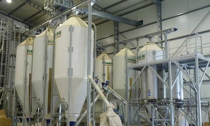 Используемые в комбикормовой установке силосы, стальные или из синтетических материалов, позволяют хранить дневной запас сырья для стабильной работы измельчающего оборудования. Приготовленные корма перемешиваются в высокоточном горизонтальном смесителе, который управляется с помощью компьютера и оснащен весовой системой. Готовые комбикорма могут храниться в силосах или расфасовываться в мешки при помощи упаковочных устройств.